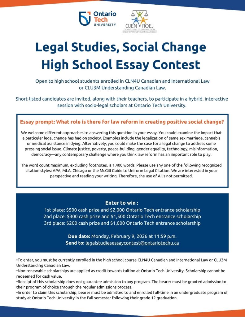 The Canadian Law and Society Association and Ontario Tech University invite Ontario high school students to enter an essay contest on the topic: What role is there for law reform in creating positive social change?